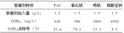 聚合氯化鋁廠家河南華泉總廠解說洗滌劑廢水處理絮凝劑種類選擇方法。為了能夠準(zhǔn)確的確定洗滌廢水處理選用哪種絮凝劑,華泉技術(shù)人員對此進行了實驗分析,實驗選用某洗滌劑生產(chǎn)廠的洗滌劑廢水為實驗水質(zhì),該廢水主要包括:洗滌劑生產(chǎn)原料洗滌水、生產(chǎn)過程廢水、各種容器的洗滌水和一些生活污水等。絮凝劑的種類關(guān)系到生產(chǎn)成本和處理效率,需要確定價格低廉、易得、使用方便的絮凝劑。這里,選用常用的幾種絮凝劑:硫酸亞鐵、聚合氯化鋁(PAC)、氯化鐵、明礬等對洗滌劑生產(chǎn)廢水進行絮凝實驗研究。根據(jù)實驗方法,向水樣中加入定量藥劑,固定水樣的pH值為710,實驗結(jié)果見下表。原水的CODCr為4480mg/L。